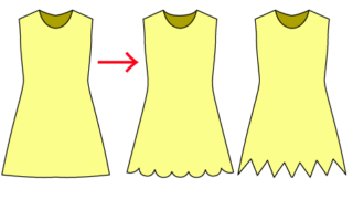 ぎざぎざにする方法 型紙のすそやそで口のスカラップ(波型の端処理)の深く入り込んだ高さのところ...