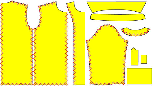 えりとカフス、身頃(胴体)の首、見返しの首と前中心、持ち出しと見返しは縫い代が中に隠れるのでほつれ止めしなくて良い。