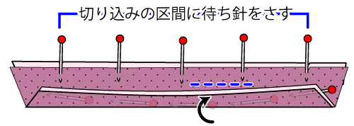しつけの印のついた方を上にして、折って待ち針を刺す。