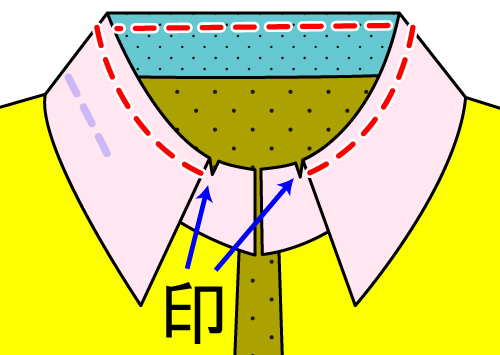 薄い生地で両方に芯を貼った場合は、台えり、表えりどちらか各1枚に印を付ける。