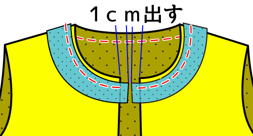 このズレのぶんを考慮してえりを作らないと、写真の右のえりのように長さの不足する表側のえりが引きつってえりの先がぴょこっとあがってしまうので注意が必要です。