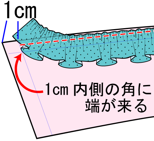 中の縫い代の収まりを良くするためには、斜めに切る角度を変えて、縫い代の斜めの長さをながくするんです。