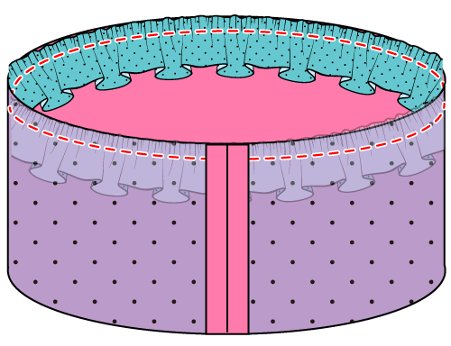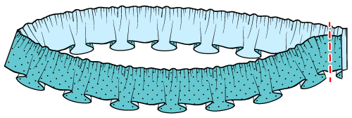フリルやレースを作りたい場合ギャザーを寄せた後、裏が見えるように半分に折る。