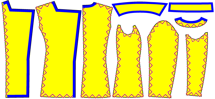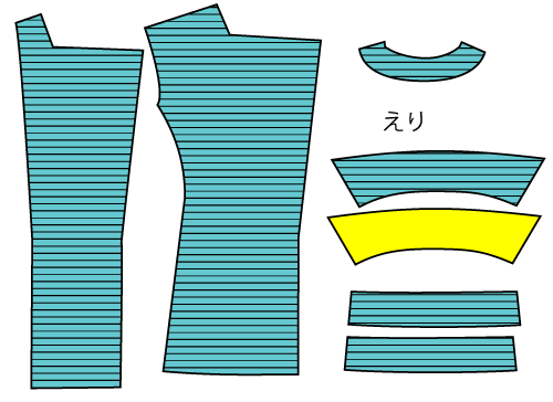 青(縫い代の端)はピンクの線に比べ、前中央側は短く、脇側は長くなる。