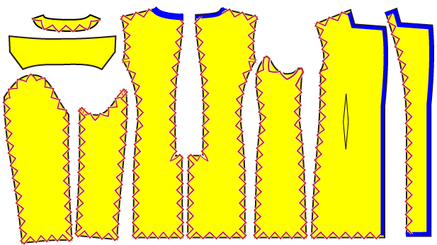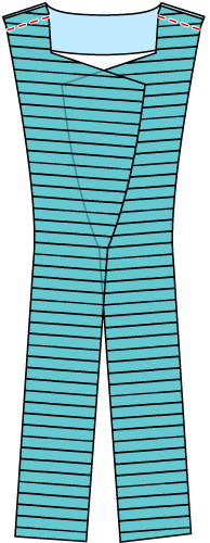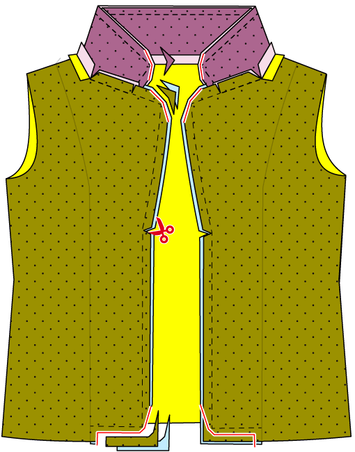 青(縫い代の端)はピンクの線に比べ、前中央側は短く、脇側は長い。