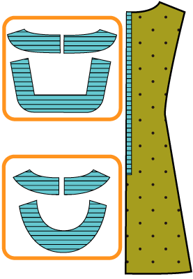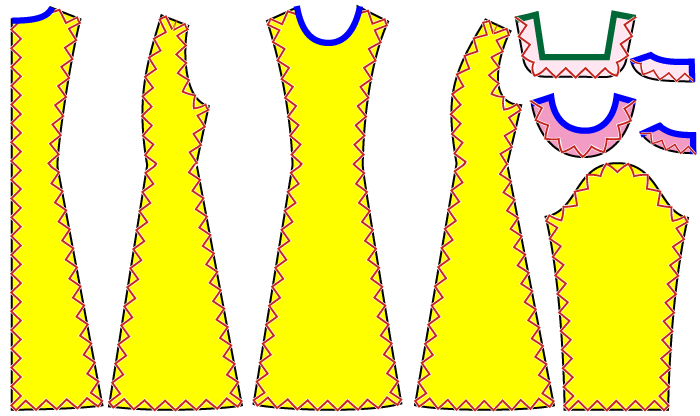 身頃(胴体)の首のカーブと、見返しの首と肩は縫い代が中に包まれるのでほつれ止めは不要です。(青線)それ以外はほつれ止めをする。