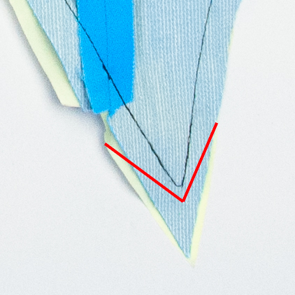 此処を切り落とさずにいると表返した時、中で縫い代がゴロゴロして先が綺麗にとがりませんよ。