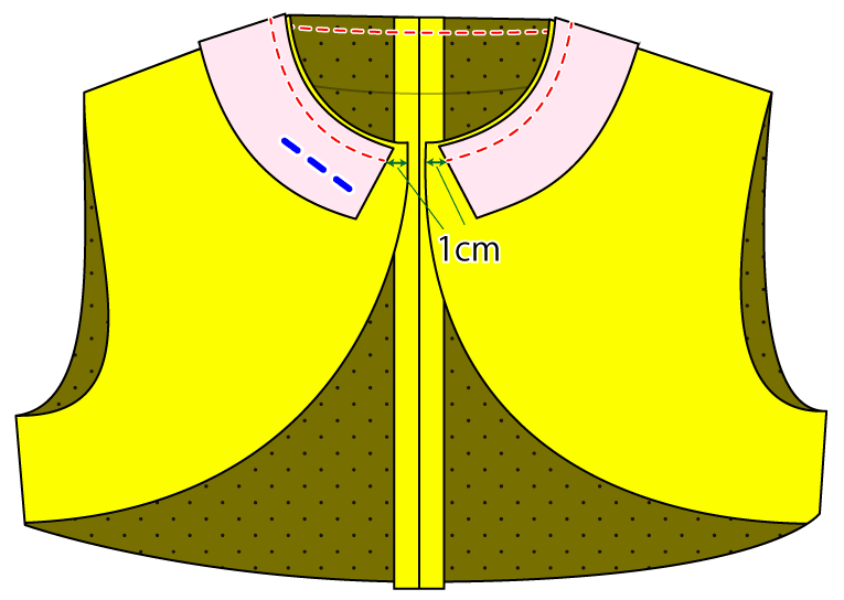 えりも首に沿って丸く付けるので、布の厚み分内外に長さの差が出る。