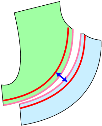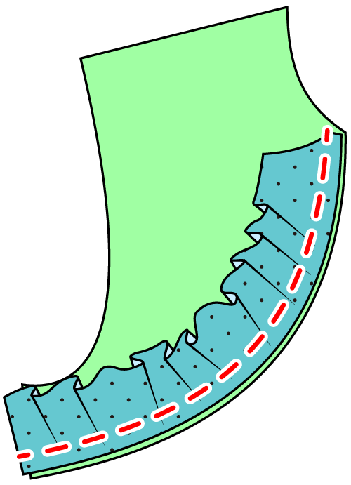 外側の生地の方の円周が長く必要なのに、ピッタリ合わせて縫うと円周の差の分が足りなくてひきつる。