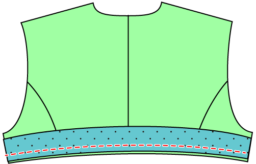 身頃の端から5mmの縫い目の上を重ねて縫うか、裏から手縫いで固定する。