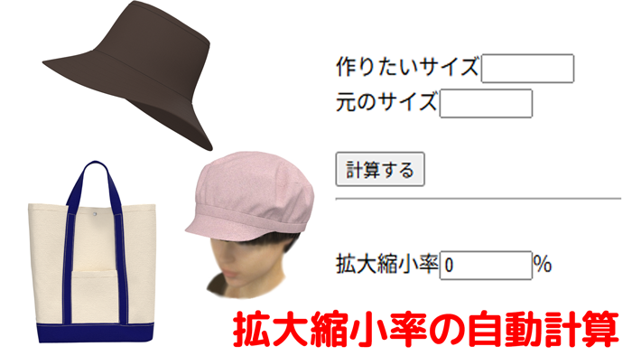 帽子やバッグなど大きさを拡大縮小で微調整したい時に、型紙に書かれた基準のサイズと作りたいサイズを入力すると、拡大縮小の倍率を自動計算してくれます。
