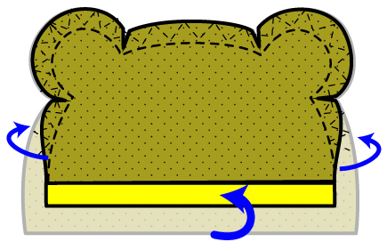 チャコで書いた線より2.5cm以上余裕がある場合、外側の端(図のテープの貼っている所)にスティックのり(消え色PIT細いものがつかいやすい)を塗って貼る。