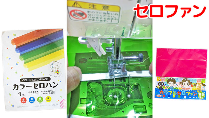 縫う時の伸びを抑えるため、帯状に切ったセロファンを、生地と押え金の間にはさむ。