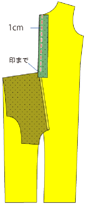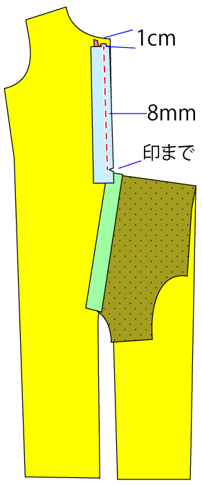 持ち出しの上は、襟(えり)をつける時に干渉しないように1cm下げて固定する。