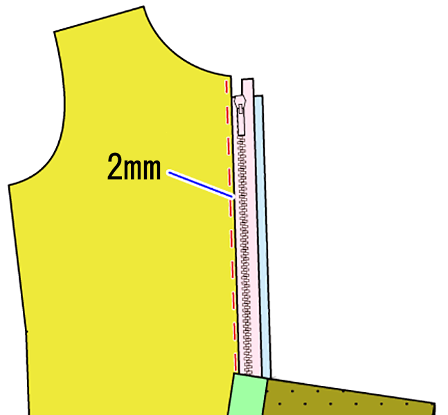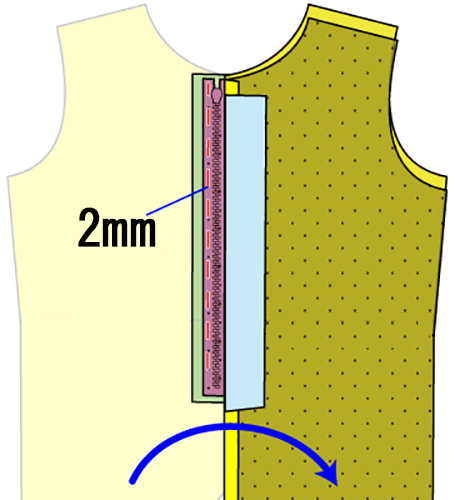 表にした右の身頃の上に裏にしたファスナーを端から0.2cmずらして重ねる。