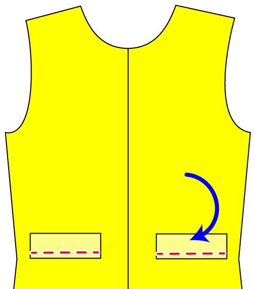 ポケット口は力がかかりやすいのでポケットの上側を図のように横に2~3度返し縫いをして三角形に縫っておくと丈夫になる。