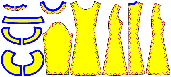 例 ピンク(出来上がり線)の長さは等しい。青(縫い代の端)はピンクの線に比べ、前中央側は短く、脇側は長くなります。