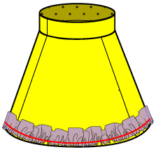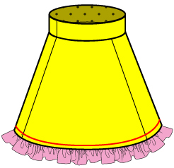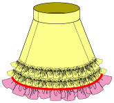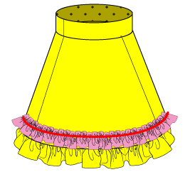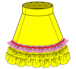 スカートの表に、表を上にしてフリルBを重ねてください。 4等分したフリルの印を、スカートの前後の中心と脇にそれぞれ合わせてください。 お好みで、ギャザーの上にリボンやレース、ラインストーンを重ねてつけてもよいです。 |