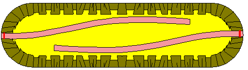 上糸は糸調節を弱く、もしくは数字を小さくするだけです 通常図Aのように糸調子は布の間でつりあった状態が綺麗といわれますが、 あえて上の糸を弱くすると、上の抵抗が弱いため下に糸が引っ張られ図Bのようになります。 |