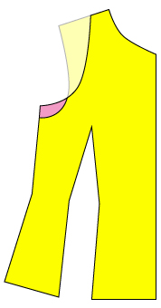 ![]() そで付の型紙をそのままにするとカーブが大きいので下着が見えてしまうので紙を足して脇を上げてください。 (足すのは型紙なので実際の服にはここは切り替えはなくつながってます) ※縫い代は省略しています。 |