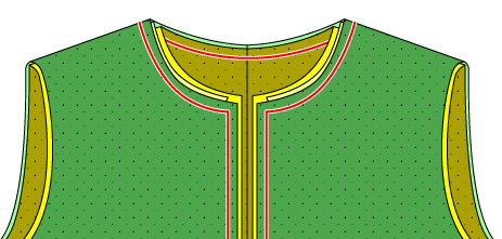 裏地をつける前にえりを表地に縫い付けます。 身頃の表の上にえりの表に見えるほう、グリムジョーだと黒い面を上にして重ね赤い線のところを縫う 仮止めなので、5mmくらいのところを縫っておきます ※)見やすいように開いて書いていますが、実際は肩を縫ってます |