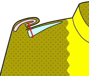 手縫いで返し縫いをしてそでの縫い代に肩パットを縫い付けて下さい。 反対側は手縫いで3〜4回肩の縫い代に縫い付けてください。 |