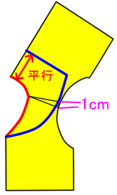 上記で5mm内側に線を足したことで、えり付け線の長さが短くなったので メジャーなどで、見ごろのえりがつくところの長さをはかって、足りない分を左のように平行に増やします。 |