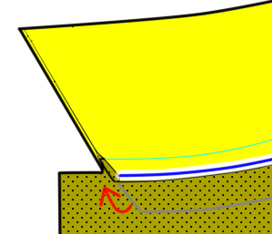 えりのゆるみを作る理由。 このタイプのえりは図のように表に折り返すためのカーブと