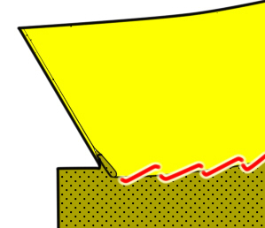 なのでその分を補うために2〜3mm表になるほう(外側に折り返すほう)を内側に入れ込んで、長さを調節する必要があります。 これをしないと図2の右のえりのように引きつってえりの先がぴょこっとあがってしまうので注意が必要です。 |