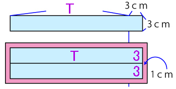 J=ウエスト+4cmに重なり分の3cm 縦3cmの長方形を書いてください。 ベルトは二つ折りして使うので実際は下の図のように、もう一つ同じ大きさの長方形を足し、縫い代をつけたものがウエストベルトになります |