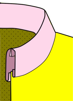 その差を補うために2〜3mm表になるほう(外側に折り返すほう)を内側に入れ込んで、長さを調節する必要があります。 これをしないと図2の右のえりのように長さの不足する表側のえりが引きつってえりの先がぴょこっとあがってしまうので注意が必要です。 |