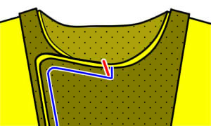 えりと、えりぐりの縫い代を、台えりの中に入れてください。。 縫い目から5mm内側を縫ってください。 |