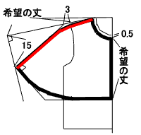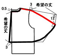 後ろも前とほぼ同じですが、余裕を持たせる為、後ろ中心の下の方をを3cm出して線を引きます。 中心をわでとってください。 赤い線は前後ろ同じ長さになるよう調節してください |