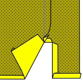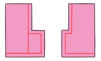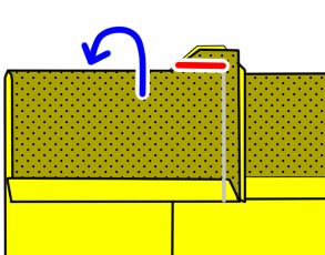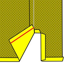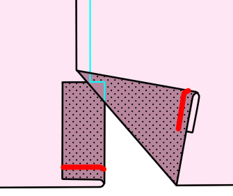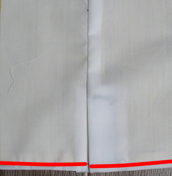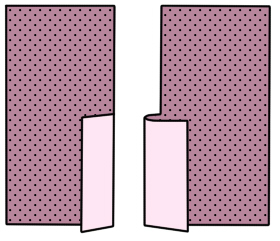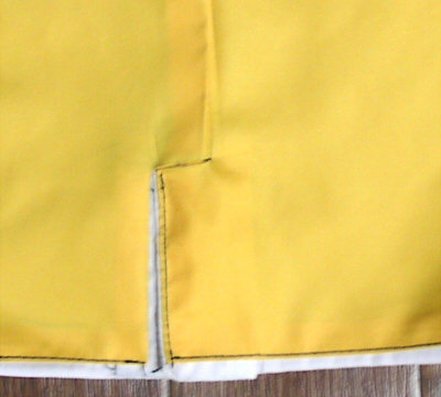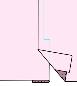 表地のスリット部分をアイロンの折り目と逆に折ってください。 すそを縫ってください。 注)見やすいよう、裏地を省略して書いてください。 |
