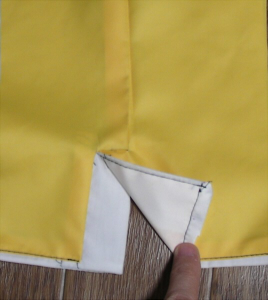 すそを表側にひっくり返してください。 裏地をアイロンの折り目通り折って縫い代を中に入れてください。 すそはミシンで縫ってもよいですし手縫いで祭り縫いして固定してもいいです。 お好みでどうぞ。 |
