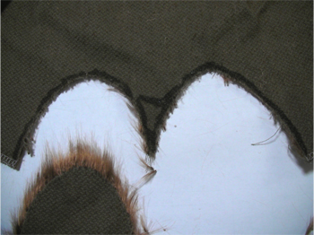 耳の内側を作ってください。 内側より毛あしの短い生地や、裏地などお好みで使ってください。 |