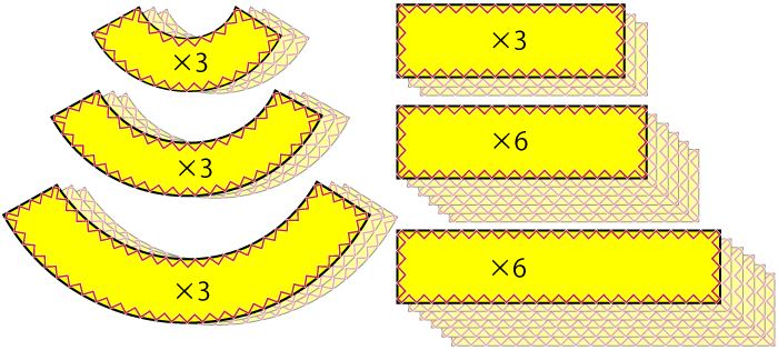それぞれの段の横を1㎝幅で縫って6枚づつをつなぎ合わせて輪にする。