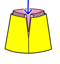 ![]() 出来上がり通り、表のスカートの中に裏地をいれて上側を縫う。 裏地は手縫いで固定する(まつり縫い) |