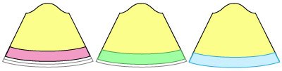 切り替えの図のカーブの所をアイロンで裏側に折ってください。 熱接着の両面テープを持っていれば、折った縫い代に貼ってください。 充分冷えたら、熱接着の両面テープのはくり紙をはがしてください。 |