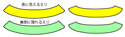 前見頃(胴体)の上に裏が見えるようにそでを重ねて縫ってください。 |