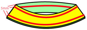 ![]() すそをアイロンで折って縫い代の端から5mmの所を縫ってください。 |