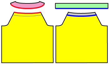 四角い型紙のえりの縫い方 えりに伸縮を持たせて体にフィットさせたいときは四角のえりの型紙を使ってください。 リブニットというよく伸びるニット生地を使ってください。 |