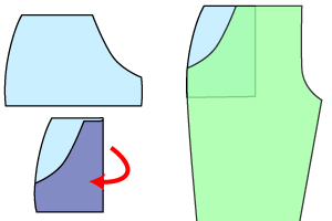 ポケットのカーブのある型紙の場合 ポケットの型紙を前身頃に当てて合体させてから布に写してください。 |